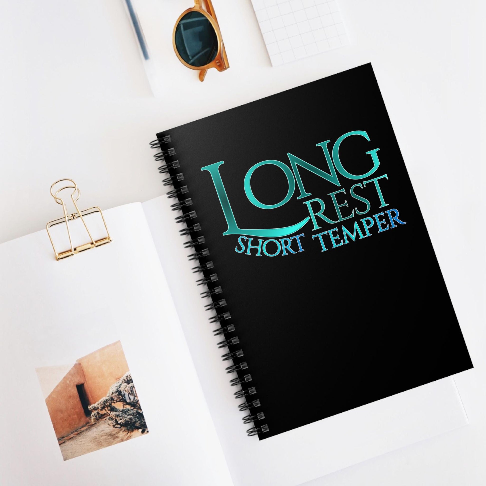 This black spiral notebook is made for campaign notes, quiet journaling, and all the thoughts that come after you finally get enough rest. The cover features bold teal typography reading Long Rest Short Temper in a fantasy inspired serif style that feels at home in tabletop worlds, goblin dens, and witchy workspaces alike. (If you'd like a different background color, send me a message!)